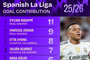 体育资讯10月7日讯 日前,Squawka统计了本赛季西甲参与进球次数排行,姆巴佩参与11球居首。