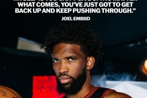 在照片上,附有恩比德的一段话:“我一直告诉自己的一件事就是,你不能放弃。无论遇到什么,你都必须重新站起来,坚持下去。”