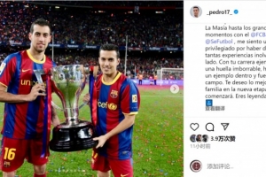 佩德罗社媒晒出与布斯克茨的捧杯合照,写道:“一位足球巨星宣布退役,感谢布斯克茨为我们奉献的精彩足球!