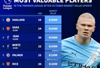 德转2025英超身价榜:哈兰德1.8亿欧居首,伊萨克涨2000万