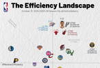 横轴代表进攻效率,越靠右越好,纵轴代表防守效率,越靠上越强。第一象限的球队多为发挥出色的球队,而在第三象限的球队通常为战绩比较糟糕的球队。