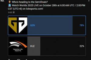 体育资讯10月28日讯 LoL官方发布S15淘汰赛GEN对阵HLE赛果预测投票。其中认为GEN获胜的占比78%,认为HLE获胜的仅占比22%。