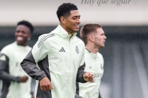 贝林厄姆更新社交媒体,晒出了下雨天团队的日常训练照,配文:新的一天到来啦!