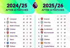 英超前10轮的比赛已经结束,英超官方发布对比最近两个赛季10轮后积分榜的对比图。