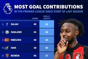 体育资讯11月18日讯 德国转会市场统计了上赛季至今球员在英超参与进球的数量,并列出榜单,萨拉赫53球居首,哈兰德40球次席,姆伯莫34球第三。