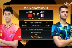 体育资讯10月1日讯 WTT中国大满贯男单1/16决赛,上轮淘汰张本智和的陈俊菘延续火热状态,3-2战胜法国选手泊雷特,晋级男单16强。