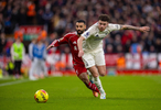 诺丁汉森林队球员威廉斯(右)与利物浦队球员萨拉赫在比赛中拼抢