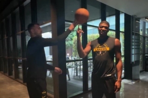 湖人向球员们发起了指尖转球挑战,里夫斯的转球时间最长,东契奇搞怪破坏了八村塁的转球。