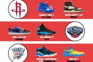 对阵火箭可能会穿麦迪球鞋还有倒钩(特拉维斯·斯科特是德州人)、对鹈鹕穿锡安的PE和保罗的PE、对雷霆则是威少的PE和杜兰特的KD 4、对76人则可能穿艾弗森的球鞋和伊戈达拉当年的PE。