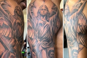 他在靠近肩膀处加上了一个天使图案,往下是大卫与歌利亚的场景,以及耶稣扛着十字架的图案。