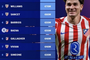 西甲非皇马巴萨球员身价前十(单位欧元):