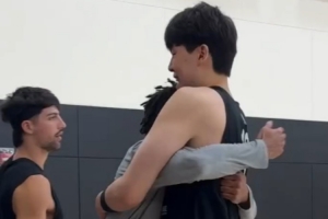 塞布尔一进门就熊抱杨瀚森打招呼,众将面对镜头笑呵呵,而夏普则一脸严肃。